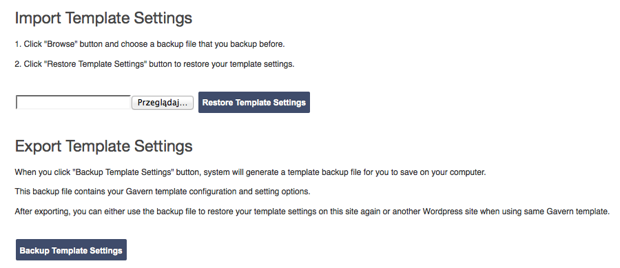Sometimes, there is a situation when you have to copy a configuration from one installation to another. In order to simplify it, GavernWP has been equipped with an import and export options of theme’s settings in “Import/Export” tab of a theme’s main menu: