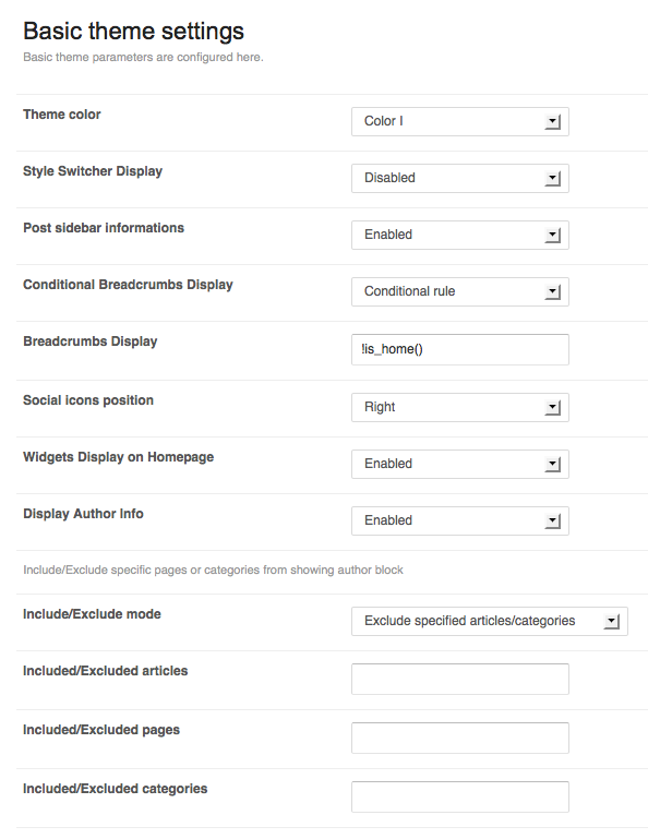 Theme color allows to choose a color version of a theme. Here, there may appear a few various fields depending on the conent of styles.json configuration file.